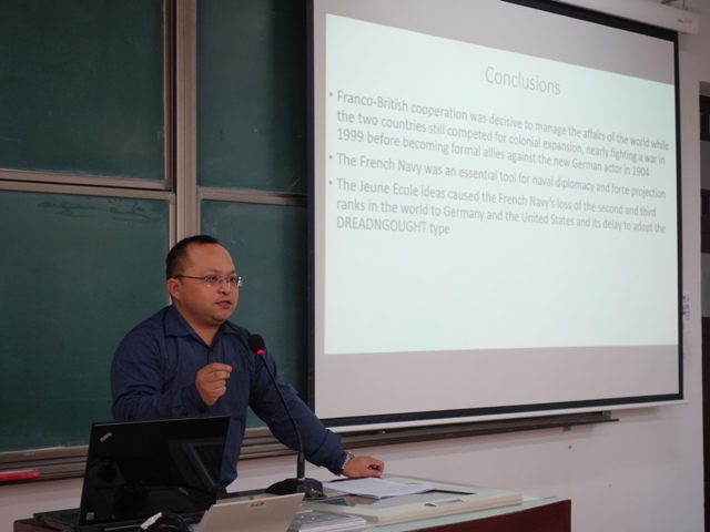2015年12月10日-13日,应开云线上平台(集团)官方网站邀请,法国国家海军史研究中心首席专家、知名学者亚历山大·谢尔东-杜普莱教授(AlexandreSheldon-Duplaix)前来北京师范大学讲学。12月11日上午,杜普莱教授走进《世界近代史》课堂,在教二教室为开云线上平台(集团)官方网站级本科生作了题为《走向无畏之海——铁甲舰时代的法国海军》的讲座。讲座由历史学院世界近代史教研室江天岳博士主持。历史学院世界现代史教研室贾珺副教授出席了讲座。前来聆听的还有来自北京师范大学和其他首都高校的学生和军事史爱好者。