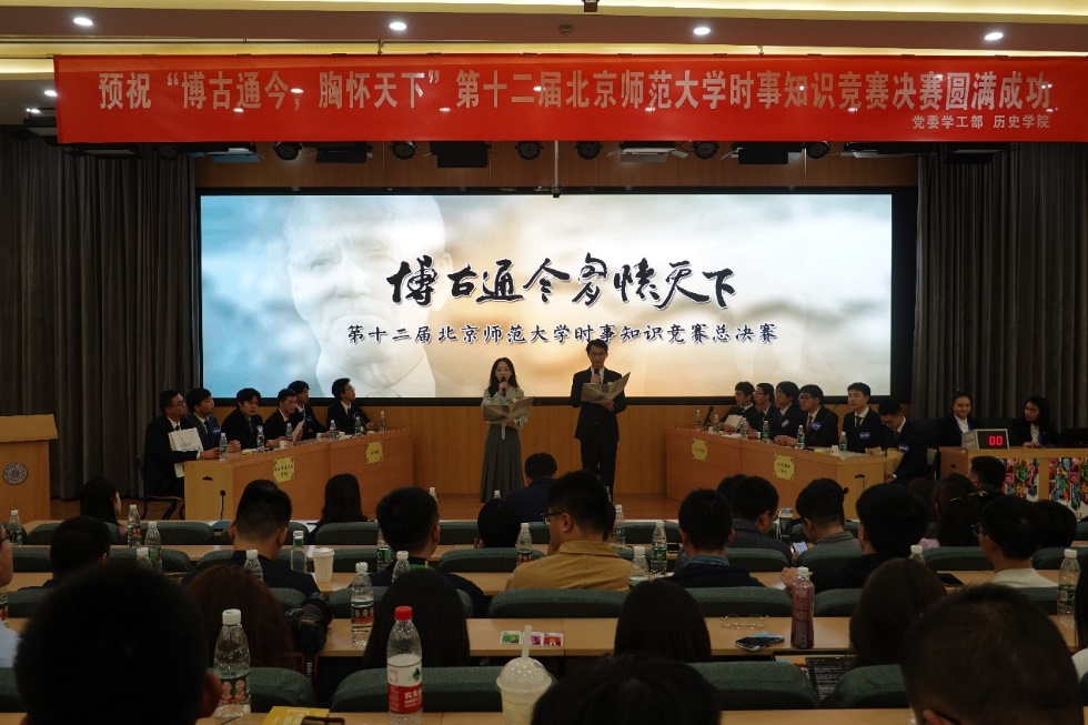 “博古通今 胸怀天下”北京师范大学时事知识竞赛自2010年起已成功举办十二届。比赛以当下时事关注为兴趣纽带,致力于探索时事研究与历史学专业学习间的融通与互动,培养学生的综合能力,成为历史专业课教学的重要延伸和历史学院人才培养的重要组成部分。比赛融知识性和趣味性为一体,凭借新颖的赛制、内涵深广的知识背景、丰富的多媒体手段,成为“形势与政策”课程的第二课堂、高校思想政治教育创新的生动实践。