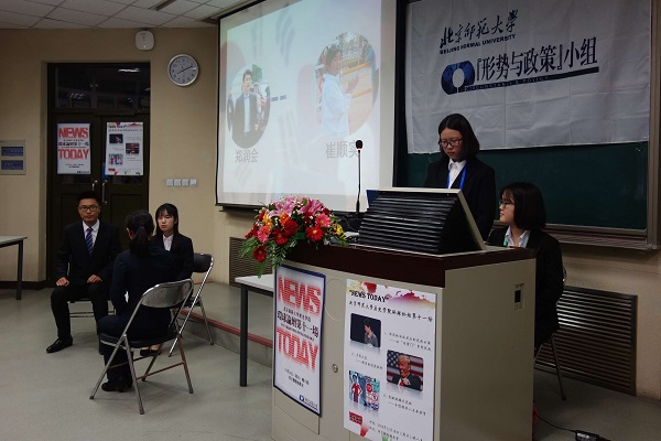 第一组代表秦雅婕同学与马宁同学以“新闻连线”的播报形式,带来《韩国政坛乱局后的风起云涌——从“闺蜜门”事件说起》的展示。该组同学从韩国总统朴槿惠闺蜜干政丑闻不断发酵,最终被韩国国会弹劾的事件切入,分析了朴槿惠“闺蜜门”事件爆发的原因和朴槿惠对待此事的态度,进而探究韩国政治体制和政治文化的特点,以及这些因素对“闺蜜门”事件的深层次影响。第二组代表张巍同学以“美国大选——撕裂的国家抉择”为题,将特朗普出人意料地当选美国总统背后故事娓娓道来。该组通过分析特朗普的经济、移民及安保竞选主张,认为美国社会中下层民众中普遍存在反经济全球化、反自由贸易的情绪,部分中产阶级与海外移民之间长期存在着矛盾,贫富差距极大,美国民众对精英阶层长期秉持“政治正确”抱有极大的不满;而特朗普竞选主张中的贸易保护主义、“民粹主义”与排外主义色彩正好迎合了广大底层白人民众的心理,这些因素构成特朗普当选的深层原因。第三组组长张学骞同学带领全组同学带来《世界女性领导人现状及未来展望》的展示。该组以默克尔难民政策风波、罗塞夫下台、蔡英文支持率暴跌为例,分成三个小组,采用针锋相对的时事评论方式,分析了女性领导人在政坛上面临的困难及其未来走向。最后,该组指出:性别是女性领导人的重要因素,但面对具体问题时不能单独谈性别这一个因素;在和平与发展为主题的时代背景下,女性领导人依然有光明前景。各组展示内容丰富、语言生动、表现力强,特别是在展示的形式上推陈出新,吸引了观众们的注意力,赢得阵阵掌声。