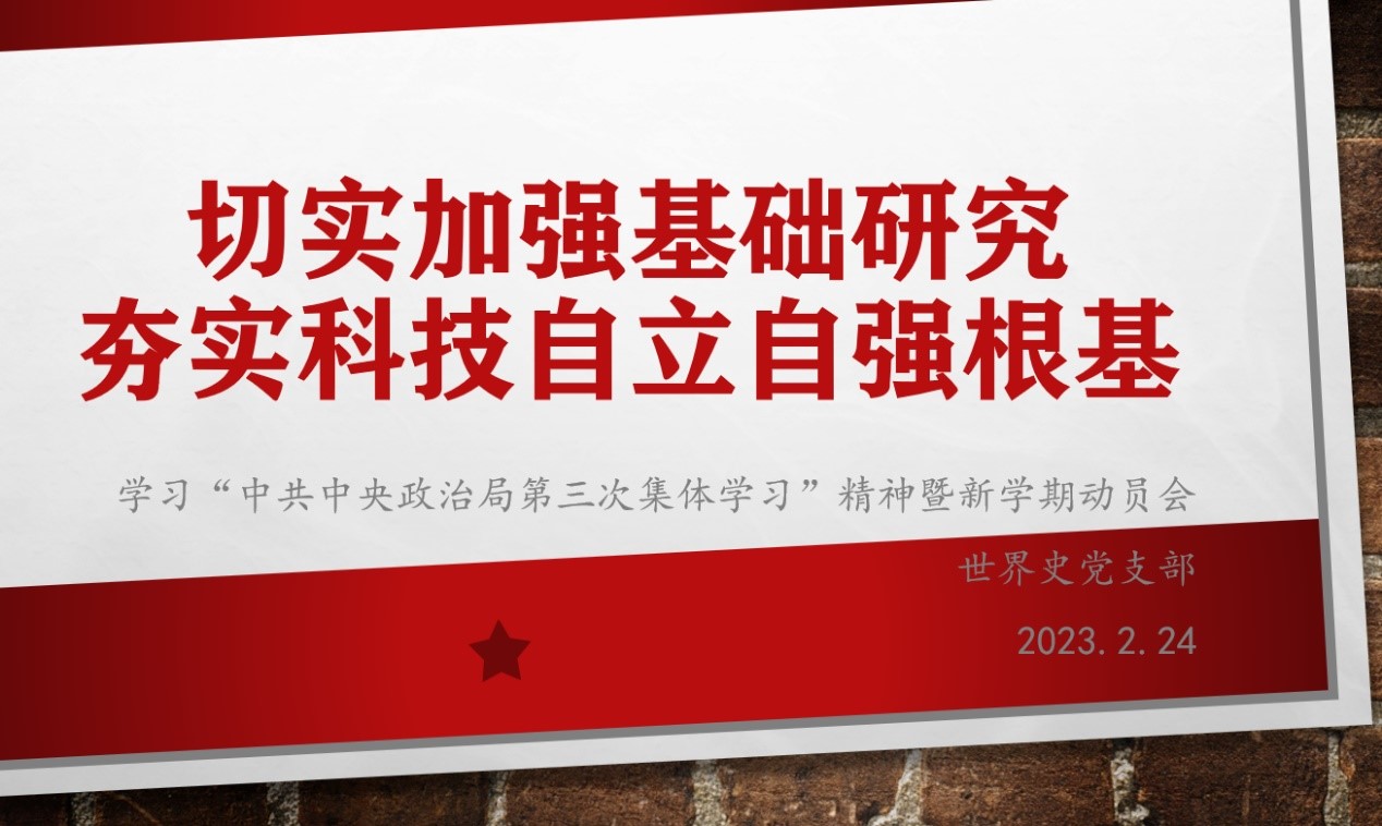 2月24日,2022-2023学年春季学期伊始,世界史党支部召开了组织生活会,历史学院党委书记耿向东老师到会。支部书记贾珺首先介绍了中央政治局关于基础学科建设的第三次集体学习内容,传达了习总书记在主持学习时的讲话精神,尤其是“支持重点学科、新兴学科、冷门学科和薄弱学科发展,推动学科交叉融合和跨学科研究”“长期稳定支持一批基础研究创新基地、优势团队和重点方向”“发挥高校特别是‘双一流’高校基础研究人才培养主力军作用”等表述,让参会老师们在备受鼓舞的同时,又感到重任在肩。
