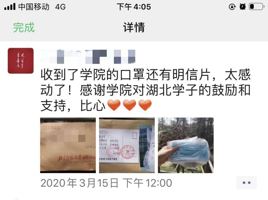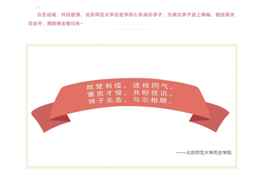 “故楚有疫,连枝同气。蕙质才俊,共盼佳讯。将子无恙,与尔相期。”3月7日女生节,历史学院师生撰写了为湖北人民加油打气的祝福语,表达了对湖北师生的关怀与牵挂。3月13日,中华儒学联合会赵毅武先生委托宁欣老师捐赠给学院口罩,学院将其转赠身处湖北地区的20名师生,一并寄往疫区的还有学院给每一位学生的寄语及书签。