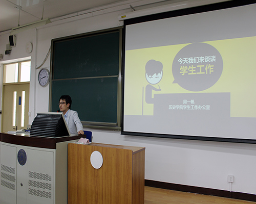 2016年4月8日下午,我院开展了历史学院2016年度青年团校启动仪式暨第一次培训 。我院分团委书记胡小溪老师和学生事务助理周一帆老师莅临现场。历史学院本科一年级的全体学生干部参与了此次活动。